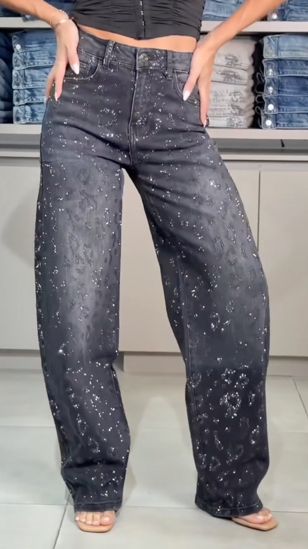 Women Fireworks Hot Stamping Rhinestone Water Washing Casual Jeans