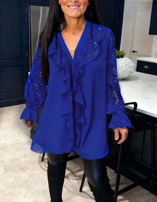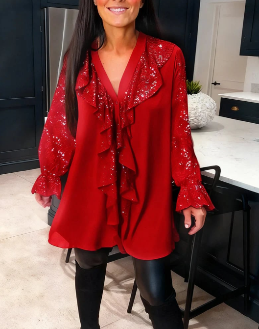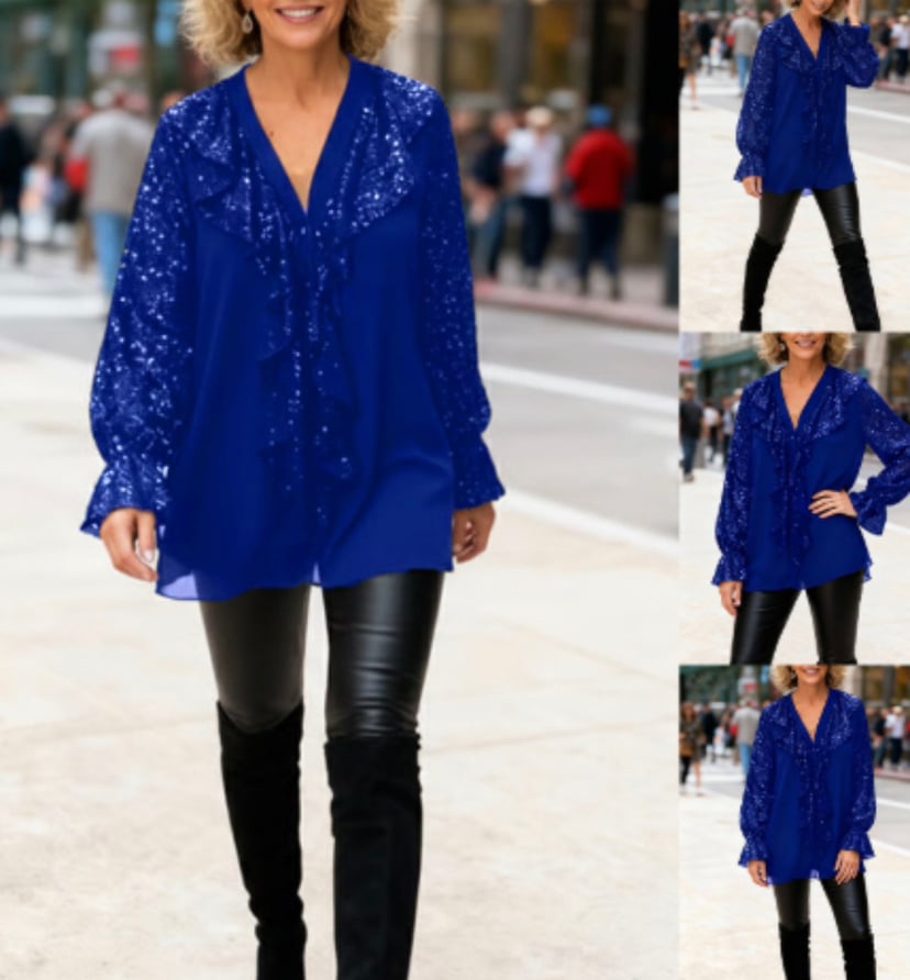 A Stunning V-Neck Sequin Long Sleeve Chiffon Blouse with Shiny Ruffles, Designed to Bring Shine and Style to Any Occasion!
