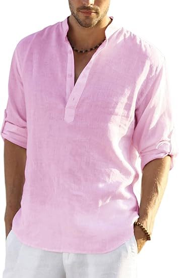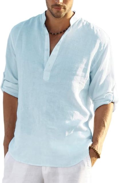 Men's Middle-Sleeved Linen Cotton Casual Band Collar Shirt